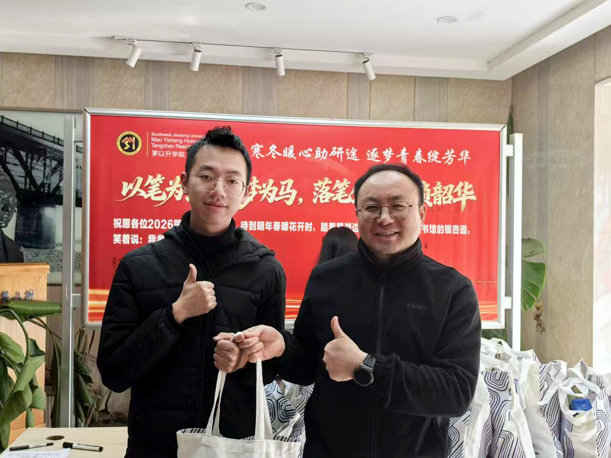 此次“考研加油站”慰问活动圆满落幕。红色主题寄语墙承载着师生们的祝福与期许,一份份兼具心意与实用的“考研加油包”,既是学院为学子们送上的物质补给,更是一份沉甸甸的精神支撑。手握礼包的考研学子们,真切感受到了来自学院与老师们的满满温情,这份温暖已然化为冲刺备考路上的强劲底气,让他们在逐梦征程上的脚步更加坚定有力。相信带着这份关怀与力量,茅院2026届考研学子们定能在研考战场上披荆斩棘、不负韶华,书写青春华章!