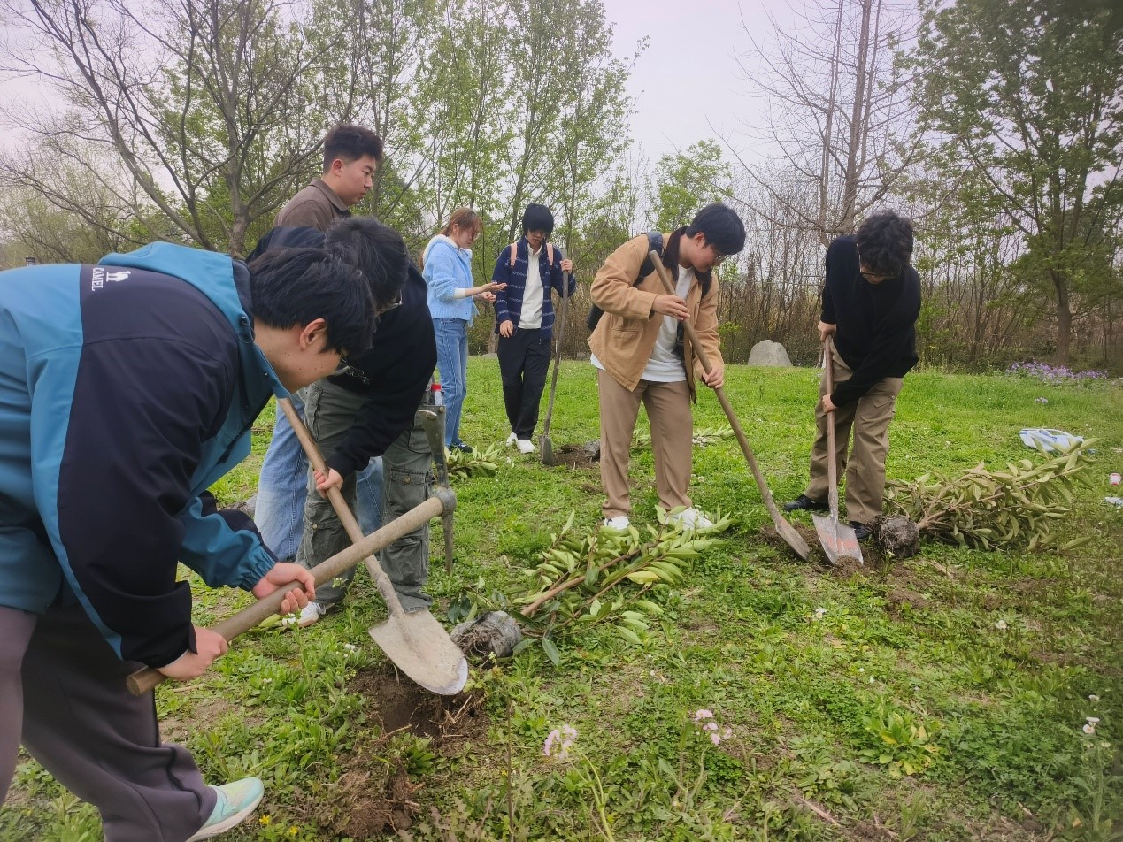 15:00,同学们前往东林艺术村,开展植树造林实践,用双手为家园增添一抹青绿。在现场,大家领取树苗、铁锹和水桶,在工作人员的指导下,分工协作、有条不紊——挥锹铲土、扶苗填坑、踩实浇水,每一个环节都做得认真细致、一丝不苟。春日的暖阳下,同学们挽起衣袖、挥洒汗水,欢声笑语间,一株株小树苗被稳稳栽种在泥土中,迎风挺立,承载着大家对绿色家园的美好期盼。